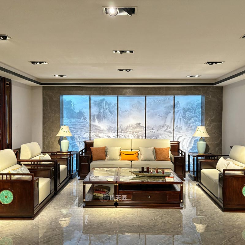 Sofa Kayu Solid Gaya Cina Baru yang Elegan ini sangat ideal untuk ruang tamu besar. Ini dibuat dengan hati-hati oleh Pabrik Kayu Merah Chuantianjiang dan terbuat dari kayu eboni yang berharga, dengan kualitas yang sangat baik. Ini adalah model berdiri di lantai, dan bentuk keseluruhannya memberikan kesan keagungan dan kemewahan kepada orang-orang. Desain sandaran tangan yang lebar tidak hanya cantik tetapi juga praktis. Bantalan empuk yang tebal membuat duduk terasa empuk dan nyaman, serta terasa seperti dibalut dengan lembut saat diduduki. Penggunaan batu mewah menjadi sentuhan akhir yang langsung menambah kemewahan sofa dan menambah suasana mempesona dan mewah pada ruang tamu.